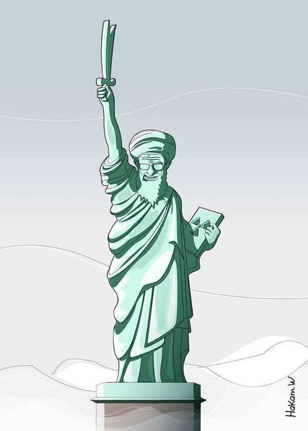 سوري Sur Twitter تمثال الحريةالجديد في أمريكا بعد اتفاقها النووي مع إيران خامنئي يحمل الكتاب النووي بيساره ويرفع سيف ذو الفقاربيمينه Http T Co 7ndcoaztgj