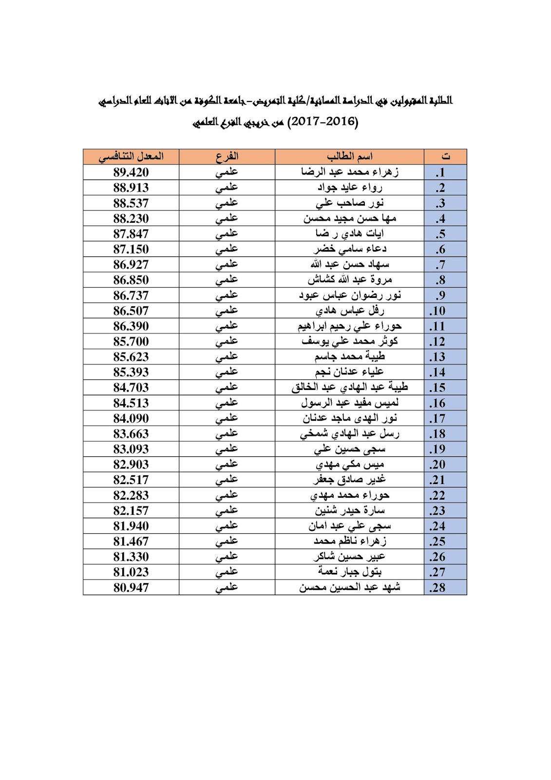 المطلبة المقبولين في الدراسة المسائية في كلية التمريض جامعة الكوفة للعام 2016 2017