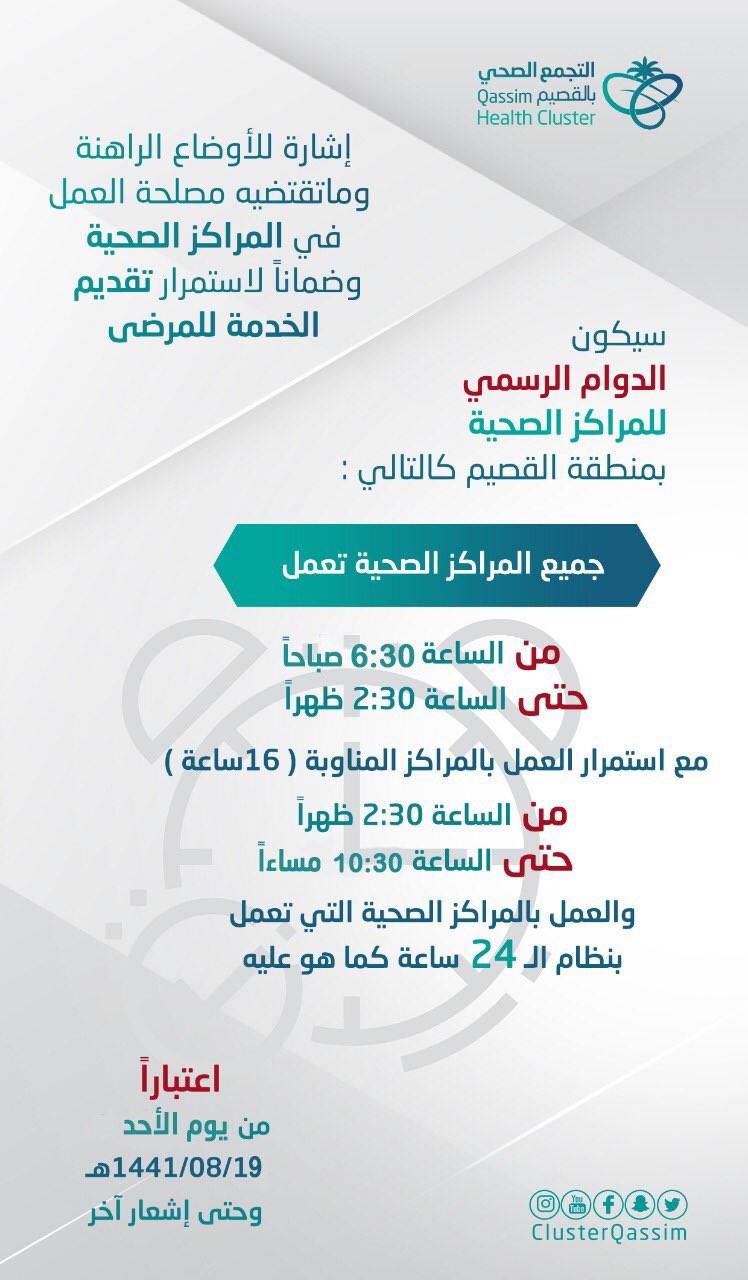 الراوي دخيل العازمي على تويتر دوام المراكز الصحية القصيم اعتبارا من يوم الاحد الموافق 19 8 1441 حتى اشعار آخر من 6 30 ص وحتى 2 30 م التجمع الصحي بالقصيم Https T Co U1wnukzj9l