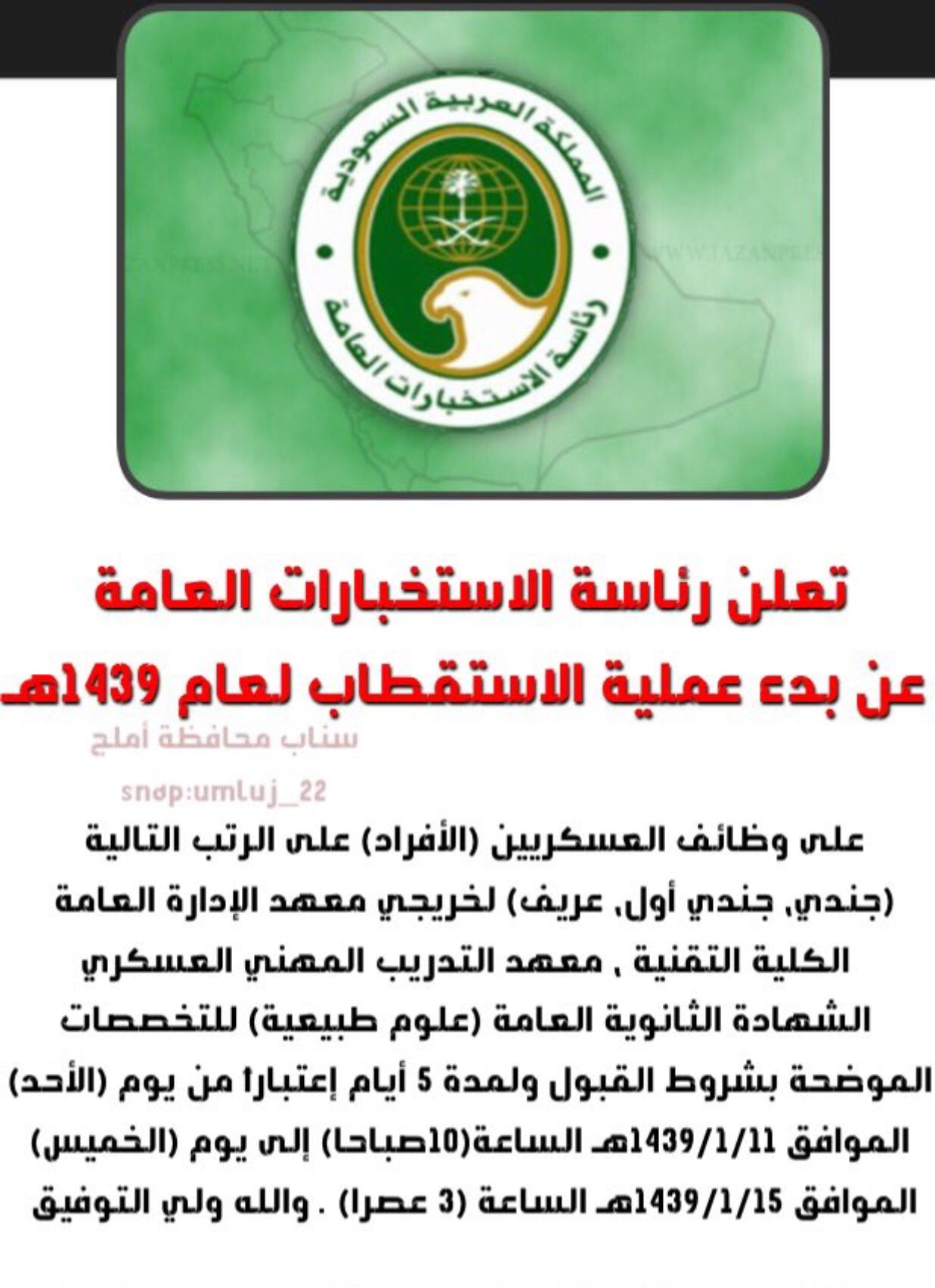تعلن رئاسة الإستخبارات العامة عن بدء عملية الإستقطاب لعام 1440 هـ على وظائف العسكريين الأفراد رتبة جندي جندي أول عريف رئاسة الاستخبارات العامة